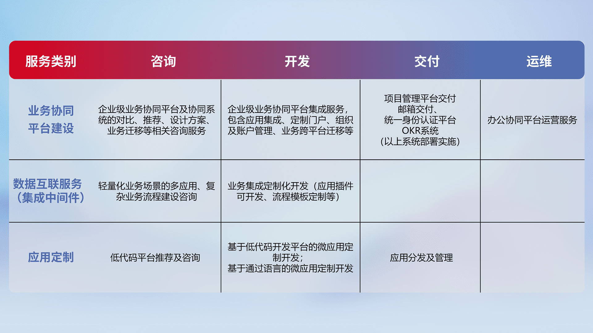 针对钉钉、、、企微、、、IDaas等平台级产品提供产品的规划、、、方案、、交付、、、定制化开发等服务,,,实现如统一协同办公、、、、智能客户服务、、、混合会议管理、、、智能数据查询、、等业务场景,,,实现数字化转型。。。