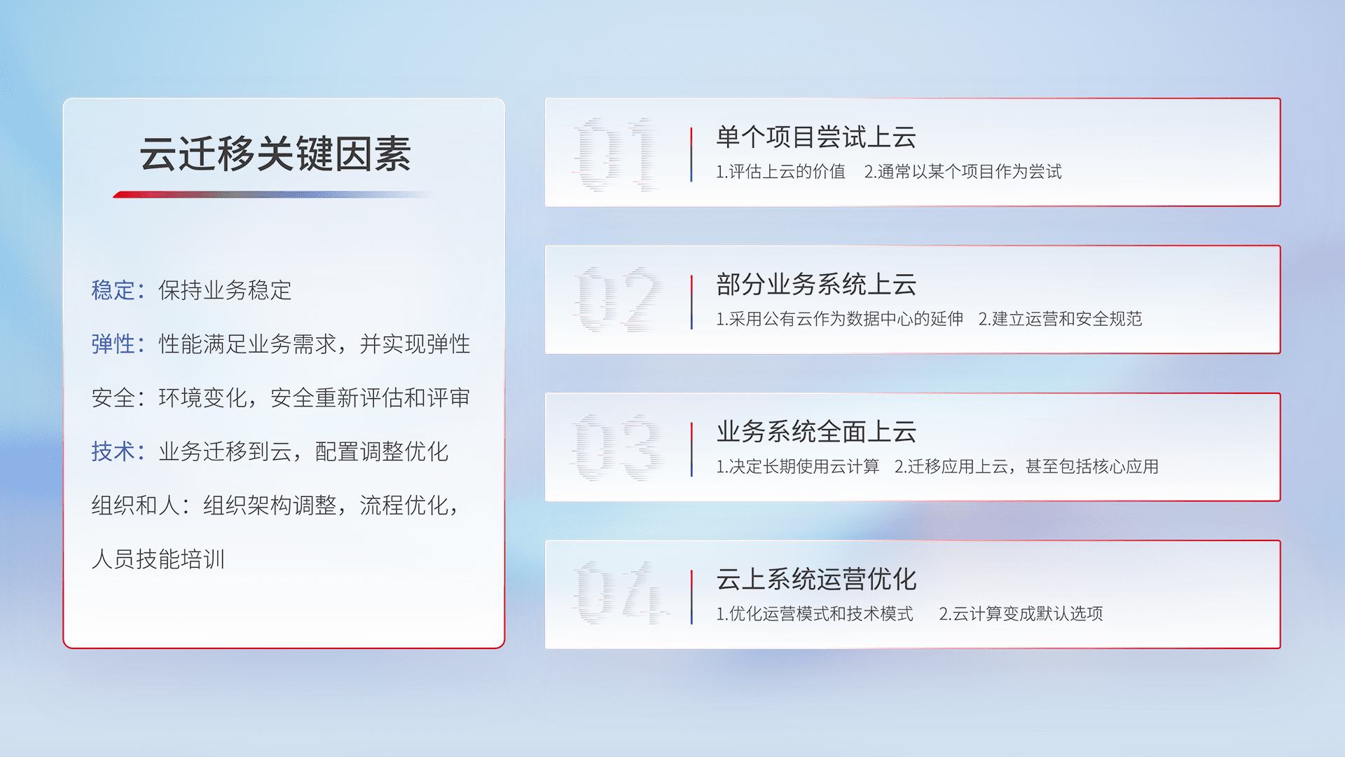 结合实际业务,,,从规划设计、、、、云平台选型、、云原生改造、、、数据迁移、、、集成交付,,,,迁移全过程为客户识别最佳上云路径,,,,做好风险识别管理,,,设计网络架构、、、身份权限、、安全审计合规、、、操作审计、、日志审计、、、、监控告警策略、、、、多站点容灾设计等,,,,对云上基础设施进行整体规划,,,提升IT治理水平,,,以满足弹性、、高可用、、高性能的需求。。