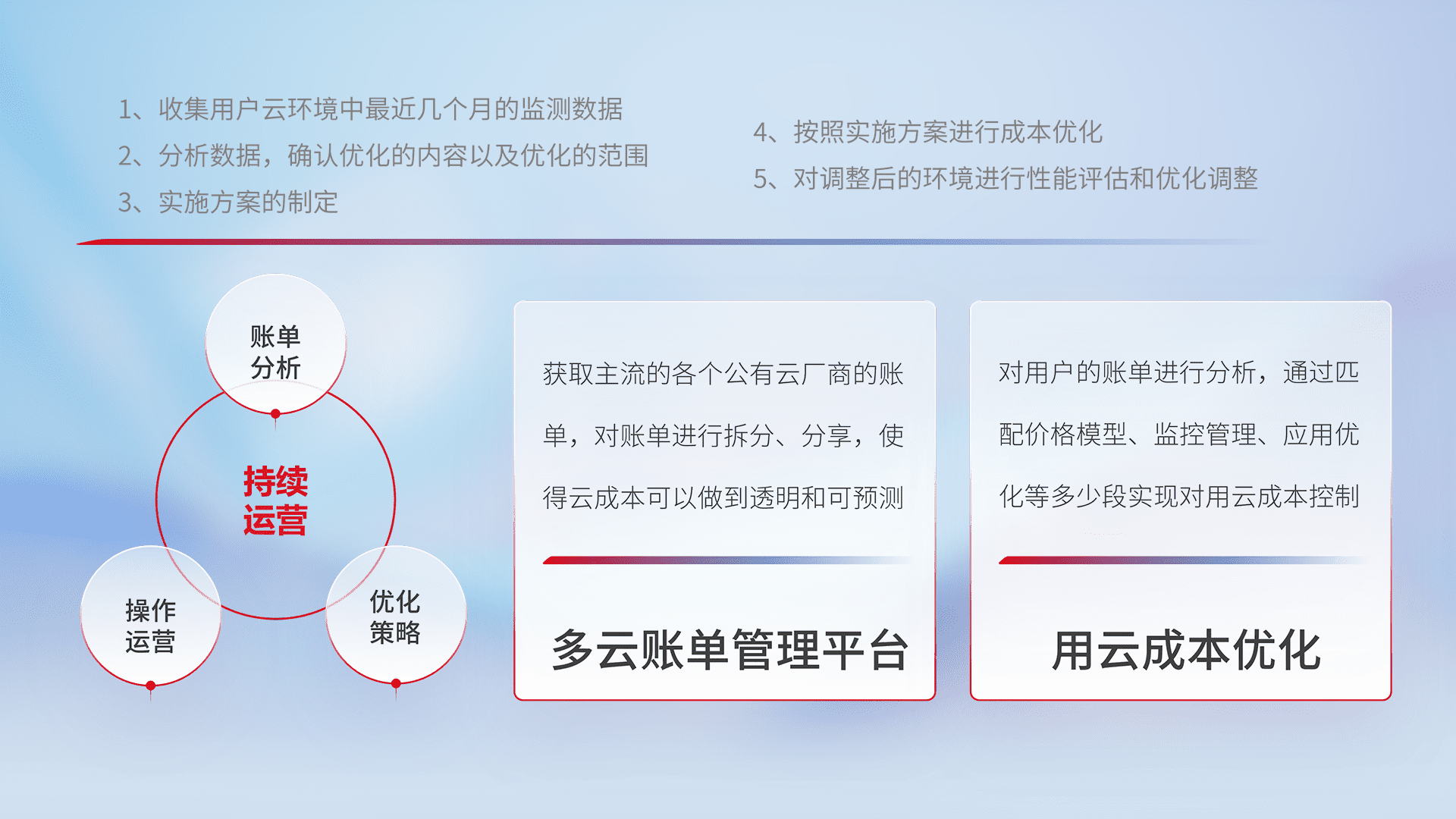 通过多云纳管,,,以统一的资源数据模型把客户的云资源进行抽象和封装,,,进而实现对多云资源的统一操作,,,,保障云资源管理的可靠性、、、、稳定性与可用性。。。。量身定制化运维内容,,,配置、、、开发运维、、、、补丁管理、、、、备份、、监控、、认证和访问管理、、审计和日常巡检等,,保障在用云过程中的可靠度,,,稳定度以及高可用率。。。。